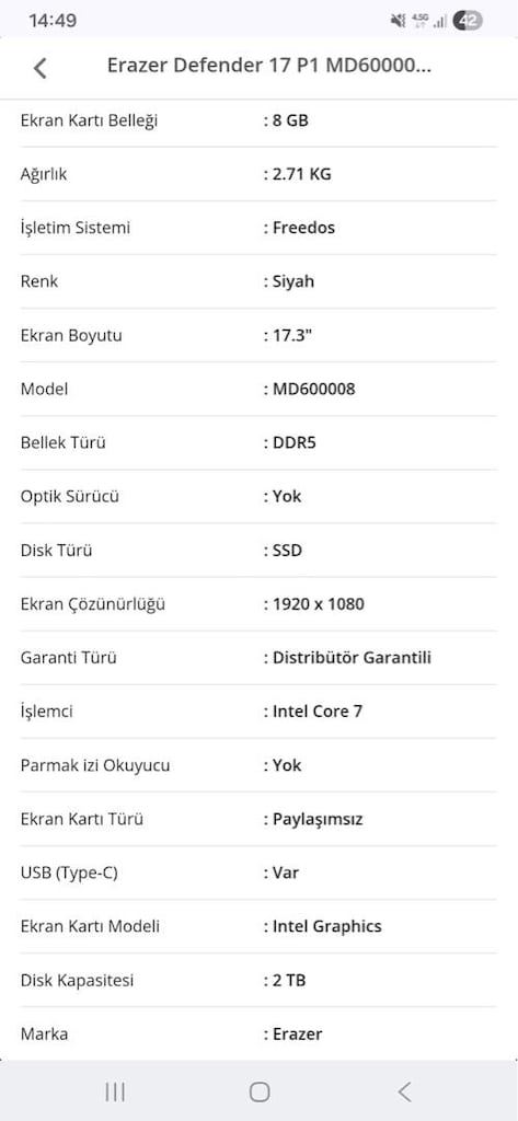 31 Mar 202610 günlük, sadece format atılıp geri freedosa döndürülmüş Erazer Defender 17 P1 MD600008 Core 7-240H 32 gb 2 tb Ssd Rtx 5060 17.3 inch Full Hd Fhd Dizüstü Bilgisayar 144 Hz