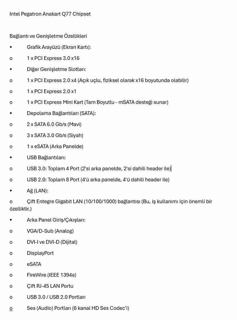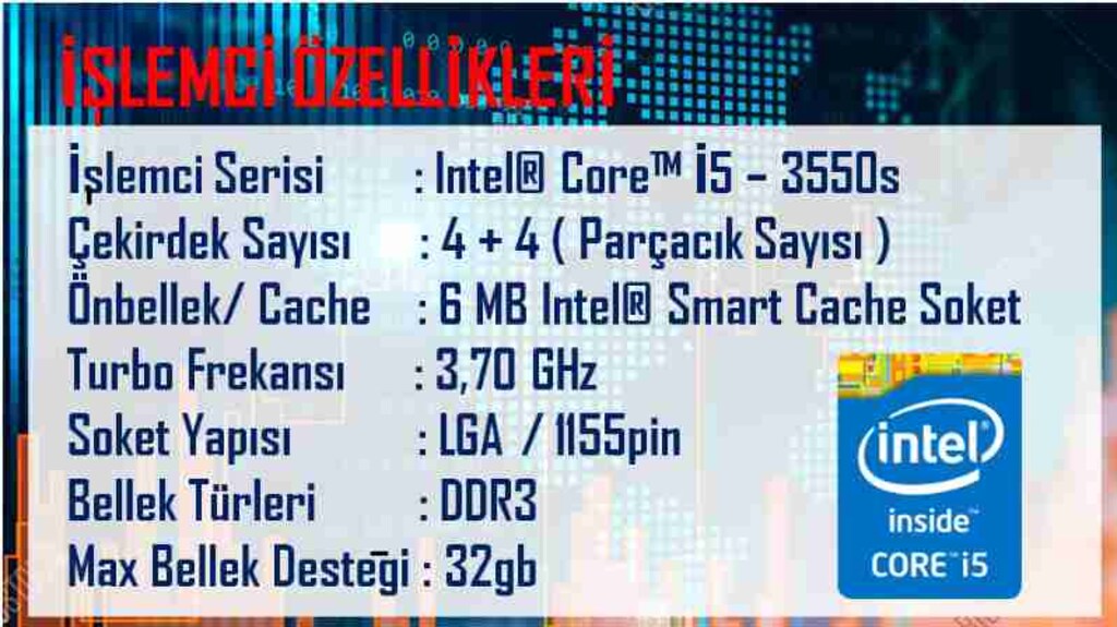 8 Mar 2026İ5 3550S İşlemci 3.0 Ghz Turbo ile 3.7 Ghz 8 GB DDR3 Bellek 240 GB SSD Disk Q77 Chipset 4 adet DDR3 bellek girişi LGA 1155 soket Orijinal Lisans (Windows 11 Pro- Ofis2024) ASUS Vento Kasa 450w Power (GERÇEK 400W)