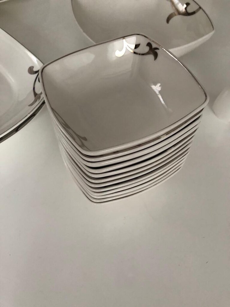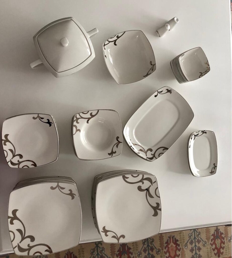 24 Mar 2026Bernardo 24 parça servis büyük servis tabağı 12 parça pasta tabağı 12 parça çukur tabak 12 parça çorba kasesi 2 parça büyük kayık tabak 3 parça küçük kayık tabak 1 çukur kase 1 kapaklı çorba tenceresi 1 tuzluk 1 karabiberlik toplam 70 parça Bernardo Bone China gümüş beyaz ince porselen tam takım eksiksiz