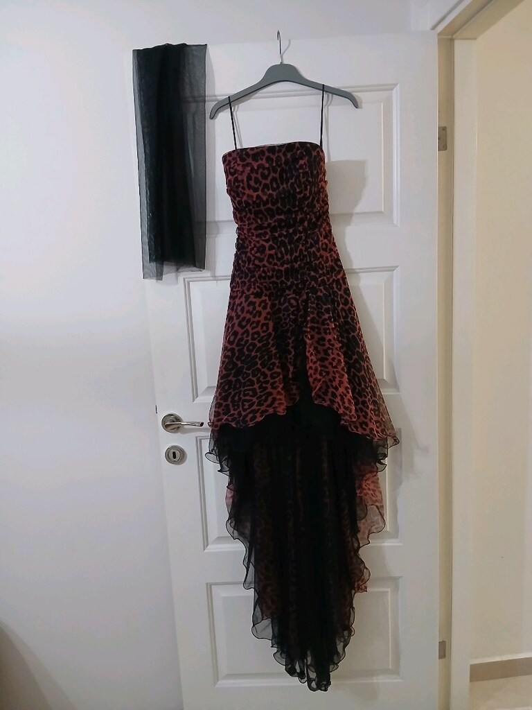 Somon Leopar Desenli Uzun Drapeli Straplez Elbise